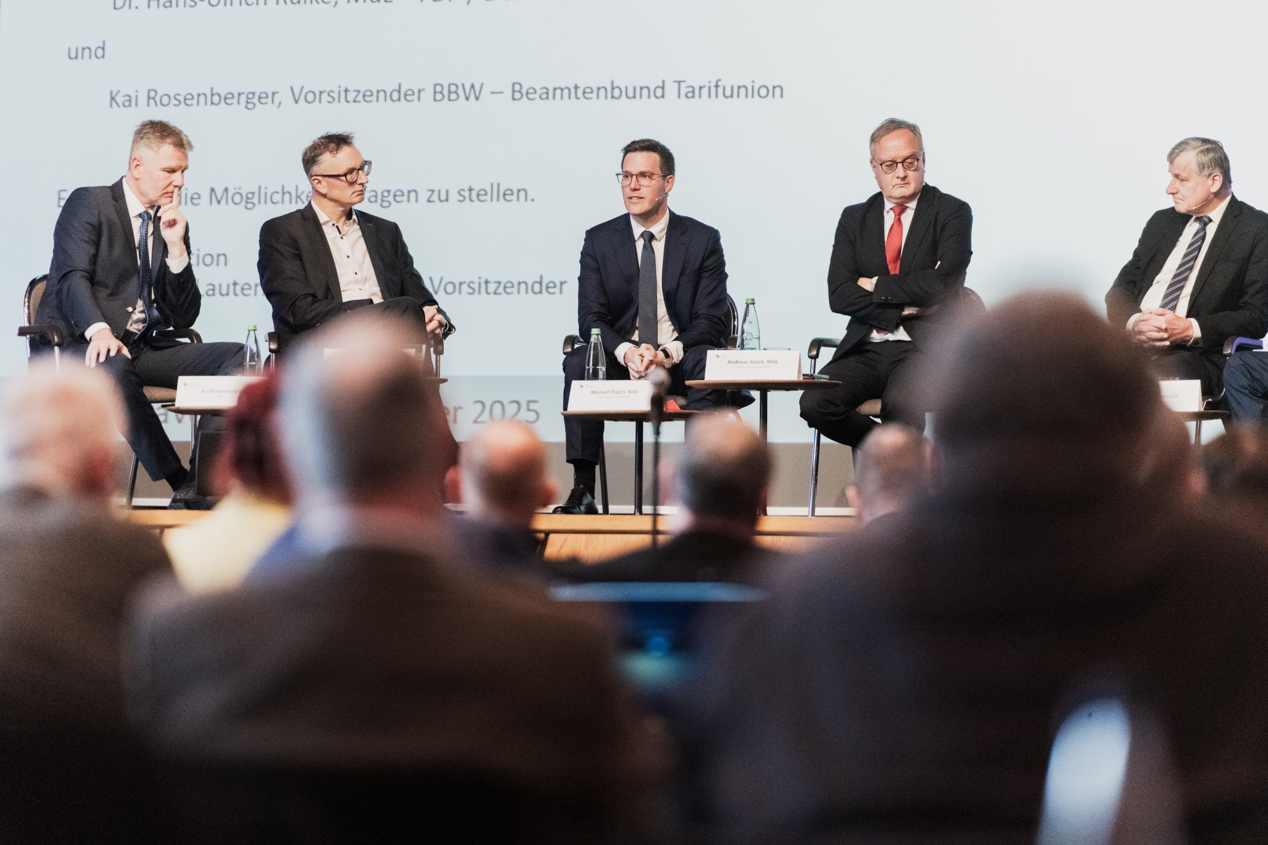 Mit über 100 Anwesenden tagte am 20. November 2025 der Landeshauptvorstand des BBW – Beamtenbund Tarifunion (BBW) im Kongresszentrum Filderhalle. Wir als VHV waren mit unseren Vorständen Tatjana Strohmaier und Herrn Dr. Homopth-Kuhs vertreten. Das Highlight war die Podiumsdiskussion mit den vier Vorsitzenden der Landtagsfraktionen von Baden-Württemberg: Andreas Schwarz (Grüne), Manuel Hagel (CDU), Andreas Stoch (SPD) und Dr. Hans-Ulrich Rülke (FDP).