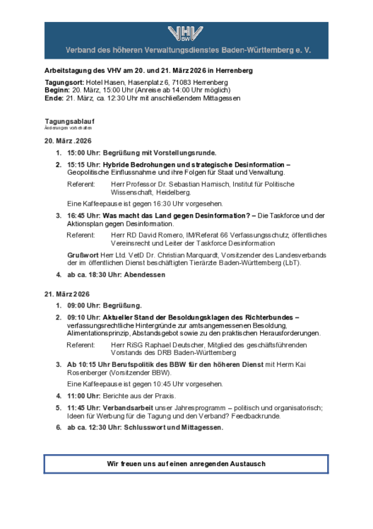 Die Arbeitstagung des Verbands des höheren Verwaltungsdienstes Baden-Württemberg fand mit 29 Teilnehmerinnen und Teilnehmern am 20. und 21.03.2026 in Herrenberg statt. Im Rahmen eines dichten Tagungsprogramms kamen fachliche Impulse unter anderem von Prof. Dr. Sebastian Harnisch (Universität Heidelberg), Herrn David Romero (Innenministerium Baden-Württemberg) sowie von Raphael Deutscher (Deutscher Richterbund) und Kai Rosenberger (Beamtenbund Baden-Württemberg).